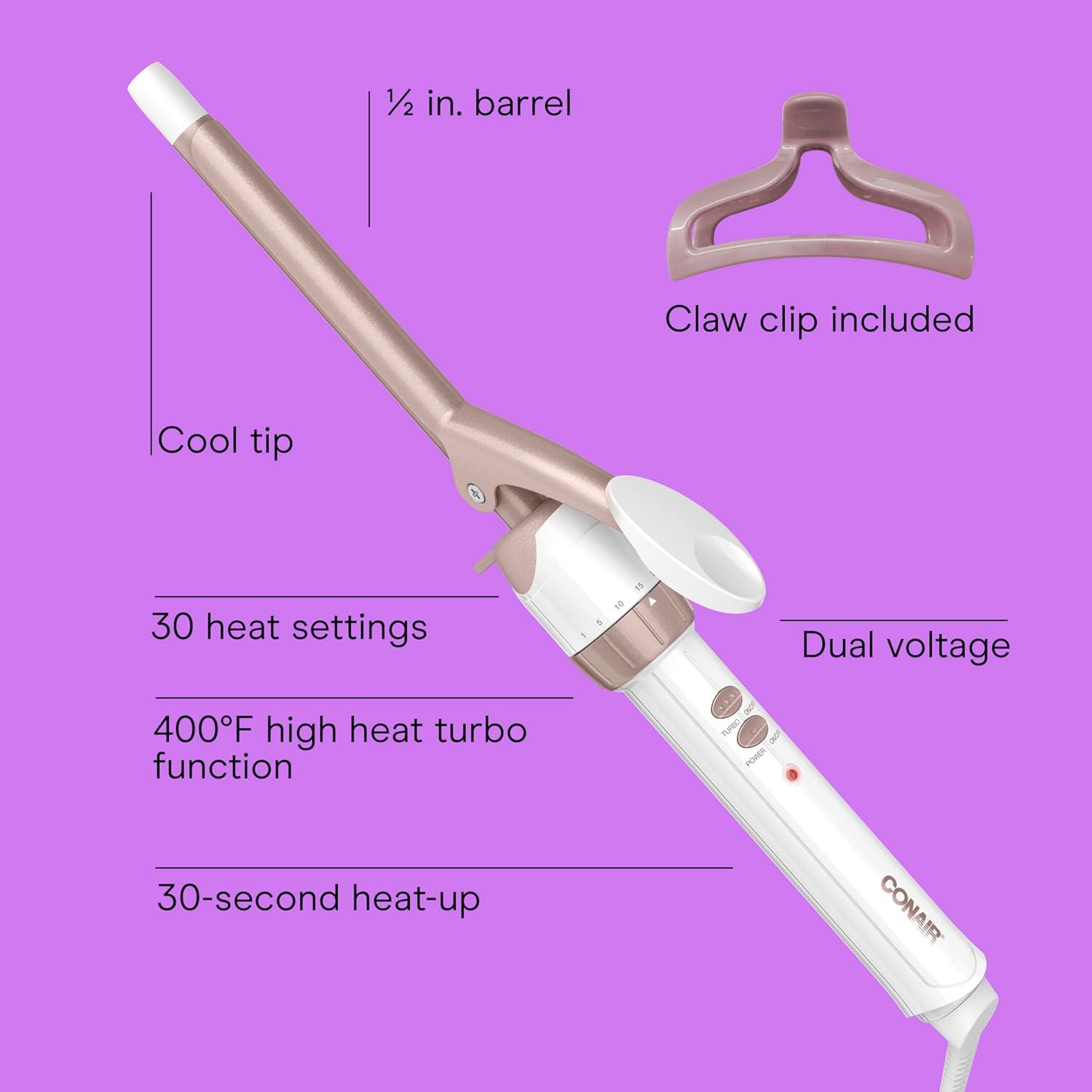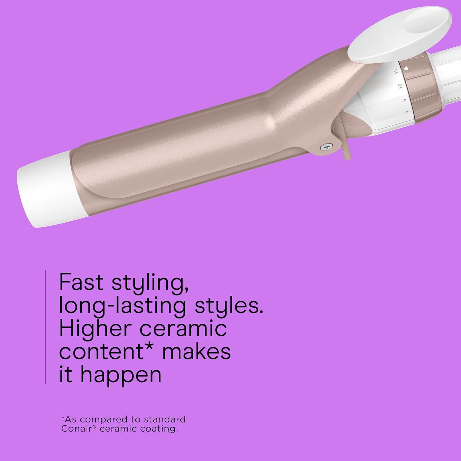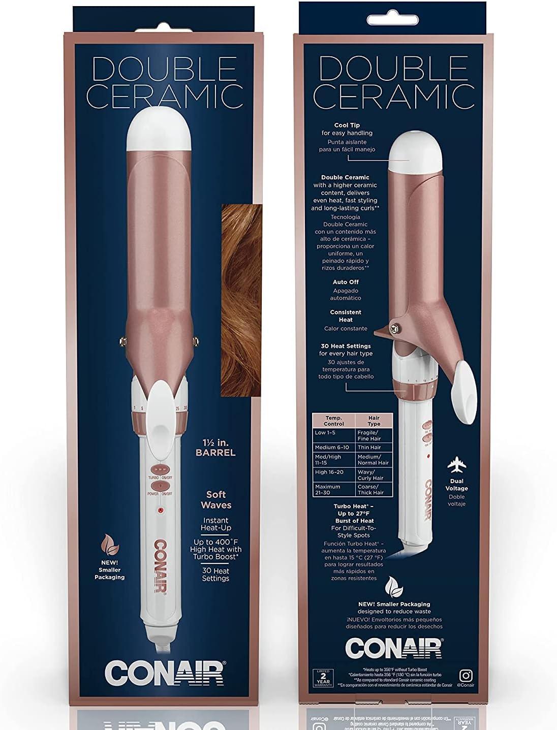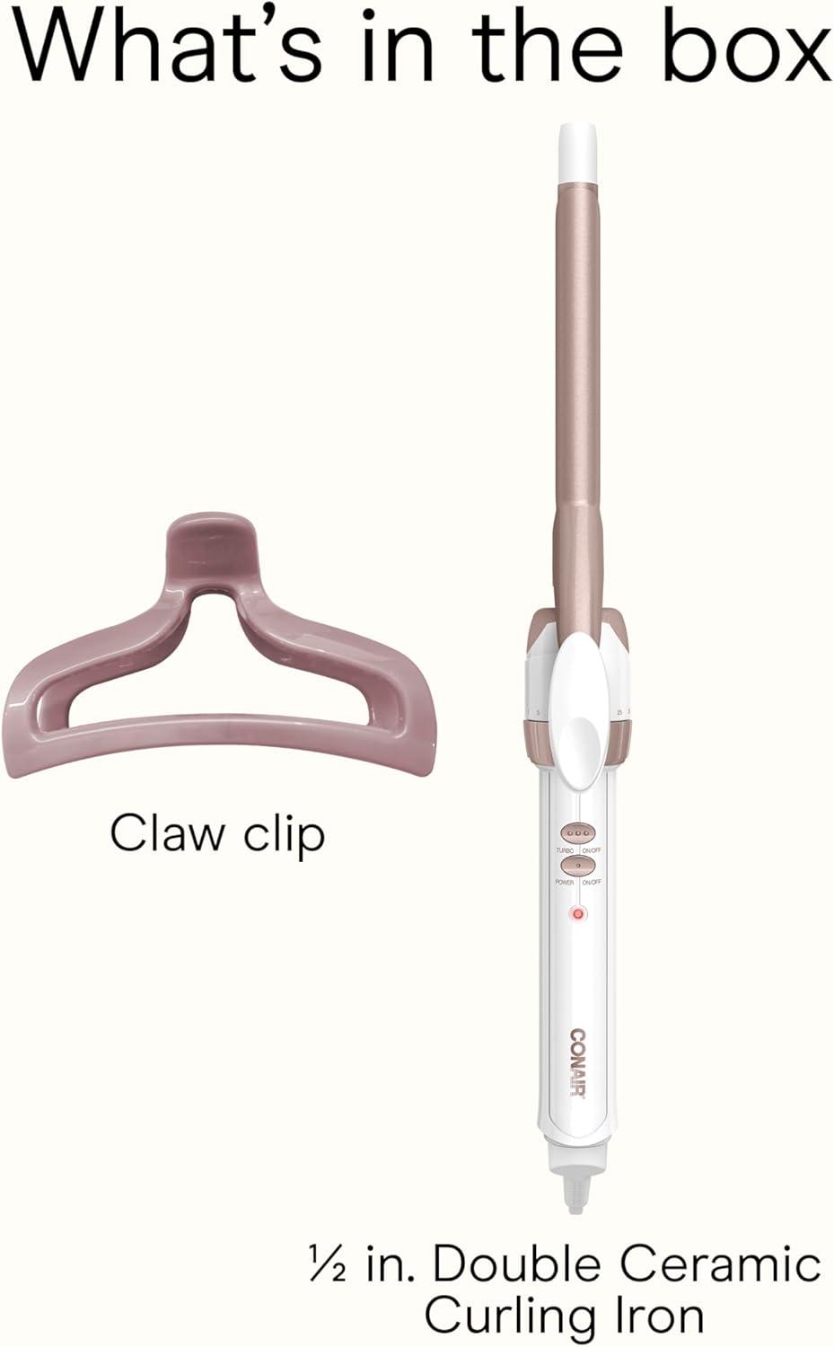 Smooth, soft curls that last? Yes, please! The Conair® Double Ceramic Curling Iron with Claw Clip delivers frizz-free, long-lasting curls. This 1 ¼-inch curling iron for long hair helps you create everything from soft waves to defined loose curls that stay all day. With 30 heat settings up to 400°F, a Turbo Heat boost, and 2X Ceramic Technology for less damage*, this hair curler gives you the flexibility to style your way, no matter your hair type. *Higher ceramic content provides even heat to minimize damage and frizz while maximizing manageability. A cool tip and Auto Off feature make it easy and safe to use, especially on busy mornings, and worldwide voltage makes for convenient travel. Whether you’re headed to a meeting, meeting up with friends, or getting ready for date night, this hair curling iron for short hair helps you step out in style. At Conair®, we empower you along your hair journey with the latest hair tools and accessories that inspire the joy of change.