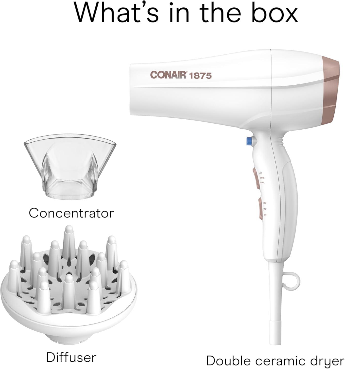 Conair Double Ceramic Hair Dryer, 1875W Blow Dryer with Diffuser and Concentrator, Ionic Conditioning, 3 Heat & 2 Speed Settings, Amazon Exclusive, White(White With Bonus Diffuser)