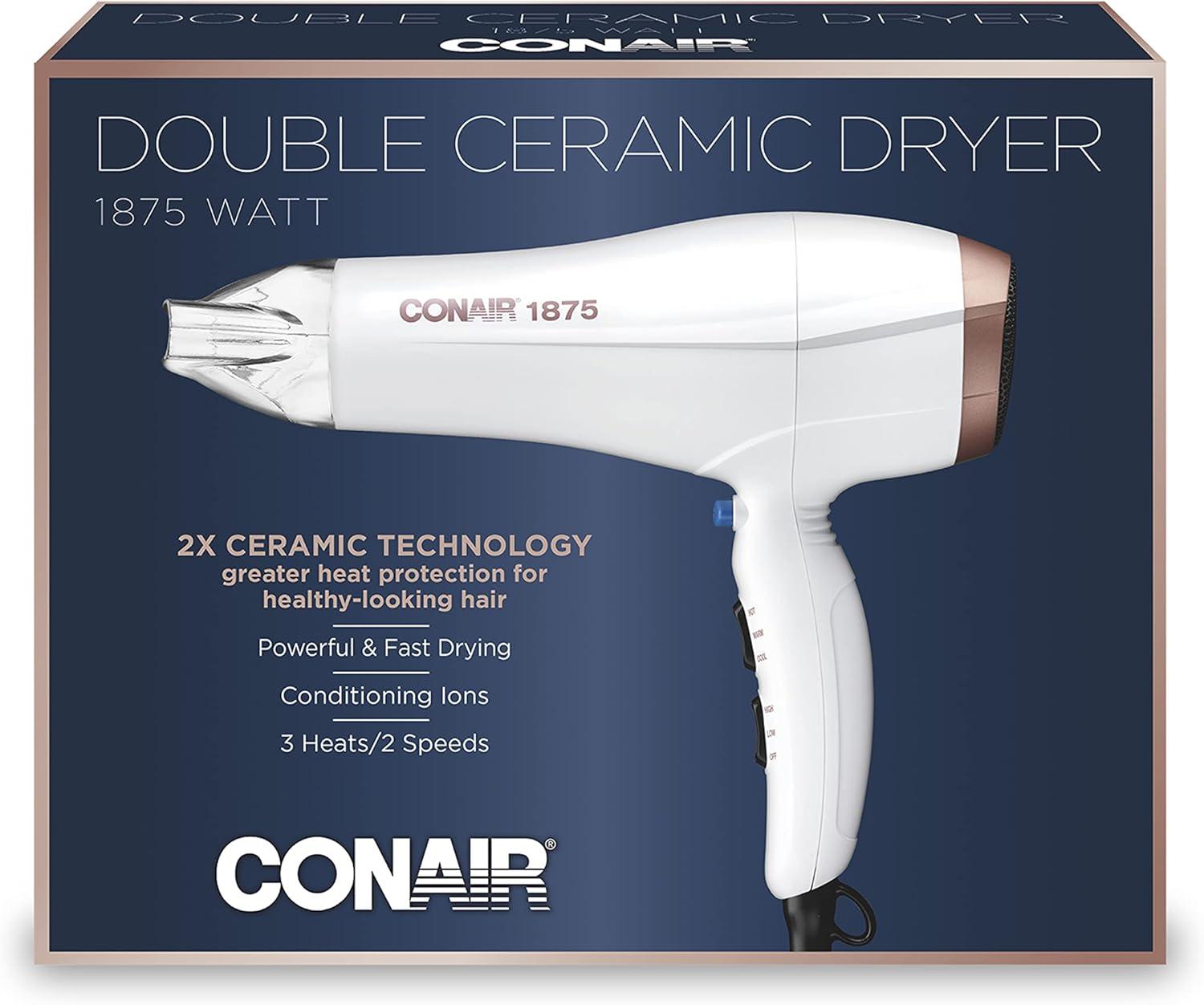 Conair Double Ceramic Hair Dryer, 1875W Blow Dryer with Diffuser and Concentrator, Ionic Conditioning, 3 Heat & 2 Speed Settings, Amazon Exclusive, White(White With Bonus Diffuser)