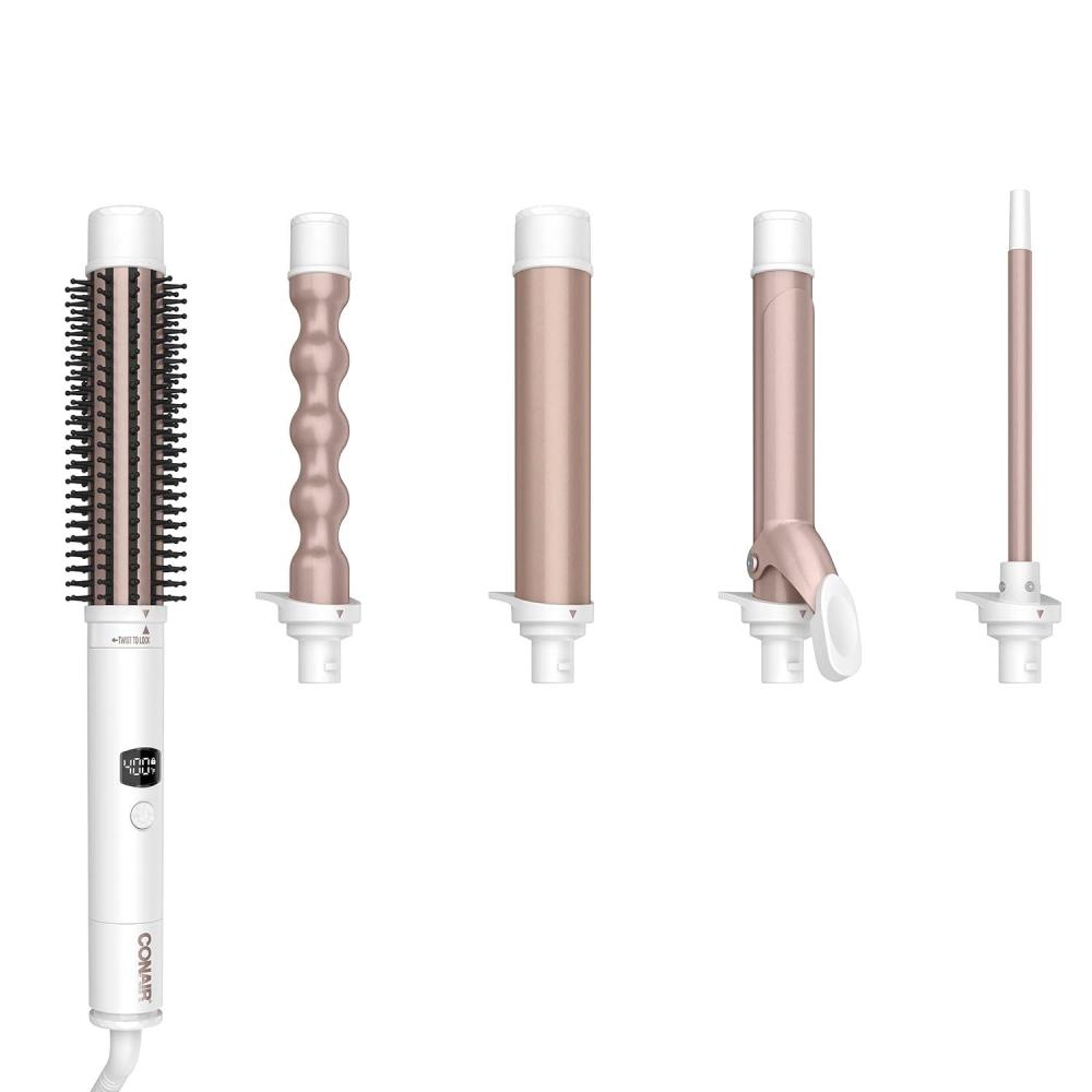 The Conair Double Ceramic Multi-Attachment Hair Styler lets you bring out your natural texture with five versatile attachments that shape, smooth, and add shine, allowing you to create every kind of curl, from long and loose to tight and coily. Featuring double ceramic technology (as compared to standard Conair ceramic coating), this hair curling iron and wand set provides even heat to eliminate damaging hot spots for healthy-looking, shiny hair. Six temperature settings and Instant Heat Technology provide styling versatility for all hair types — use a lower temperature for fine hair and a higher temperature for thick, wavy, or textured hair. The versatile power handle of this interchangeable curling iron set is compatible with all Style Chemistry by Conair attachments and includes a locking mechanism for safe styling. The Conair 5-in-1 hair styler includes a power handle, round brush, 1-inch bubble wand, 3/8-inch curling wand, 1 1/4-inch curling wand, and 1-inch curling iron.