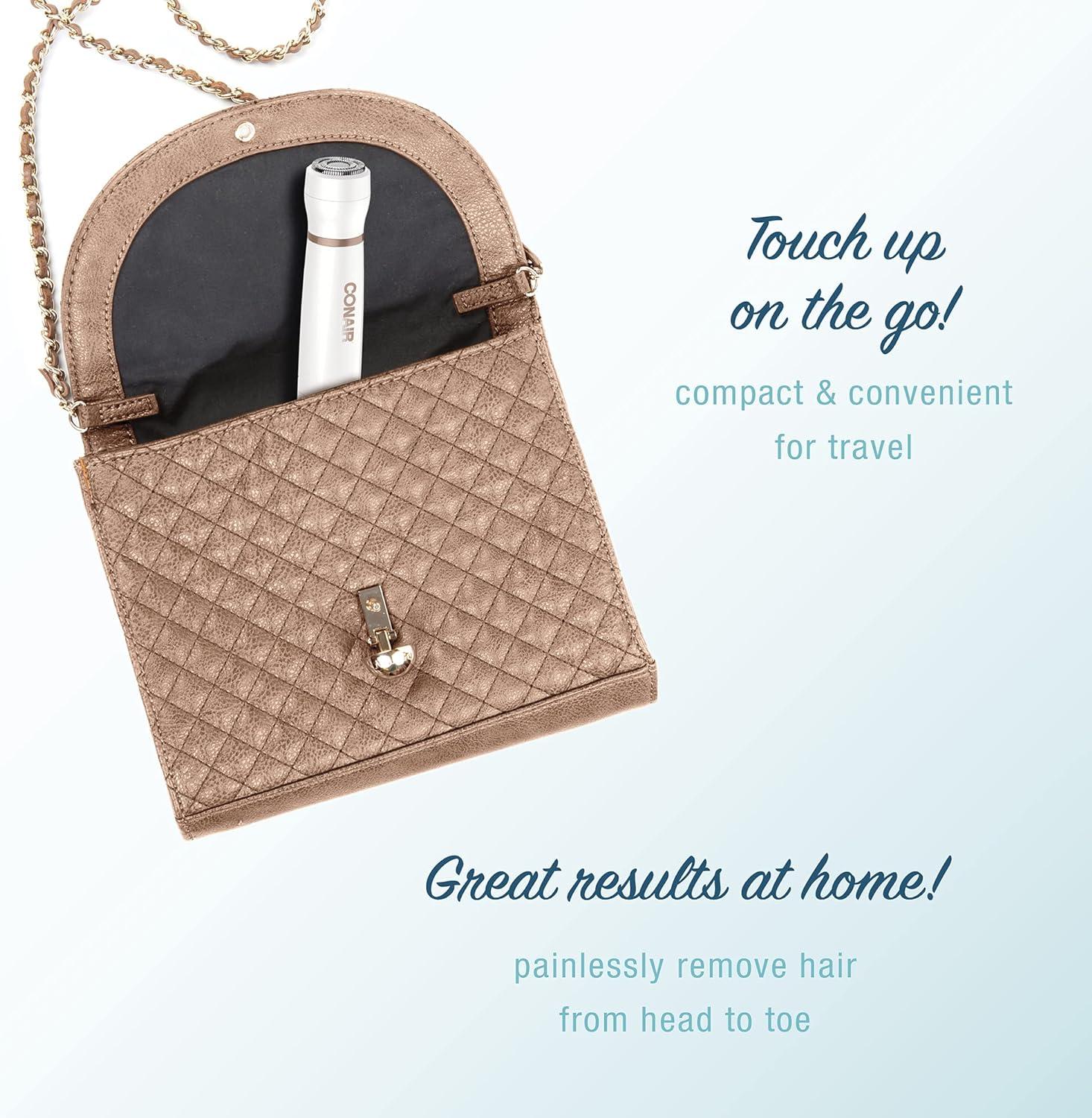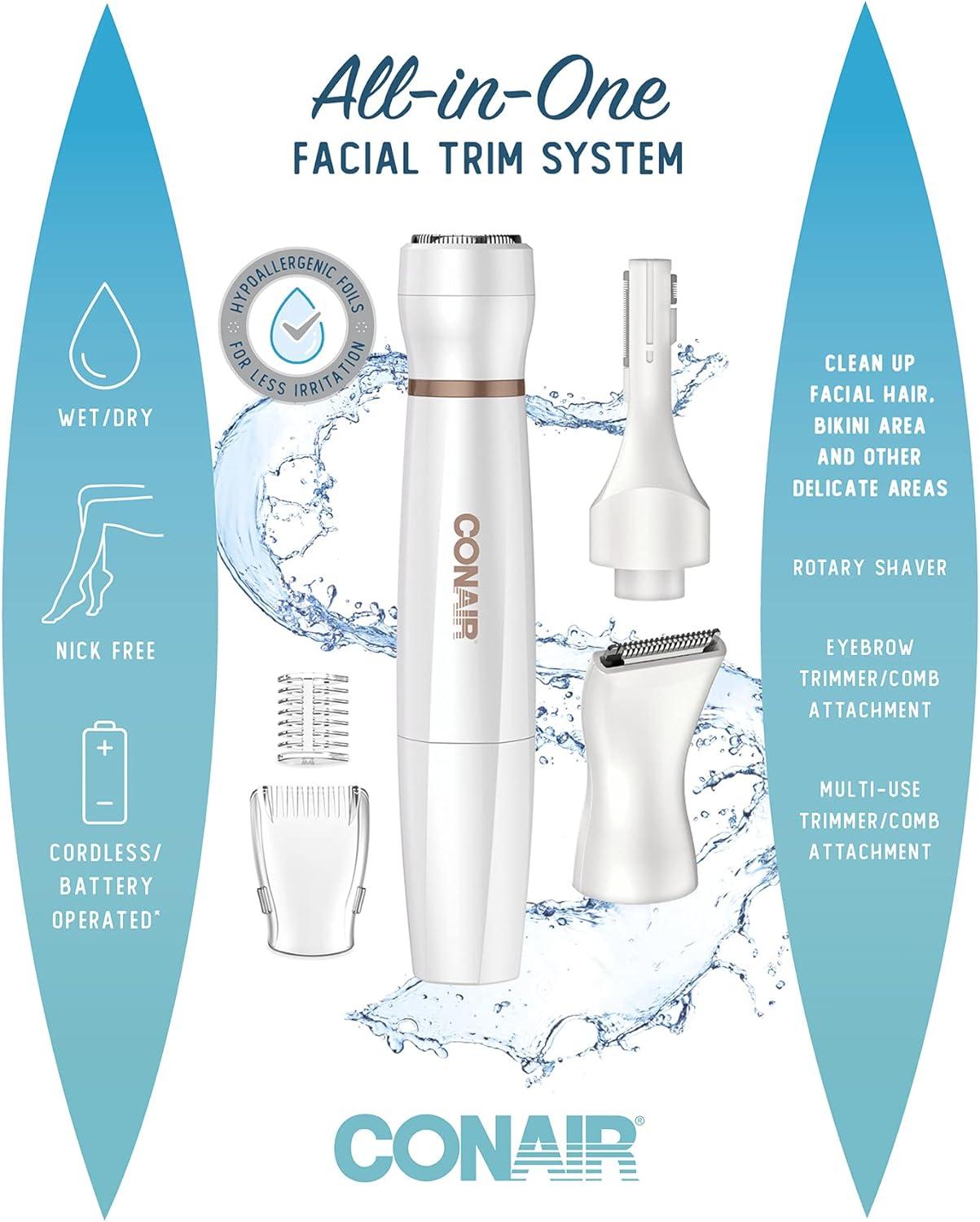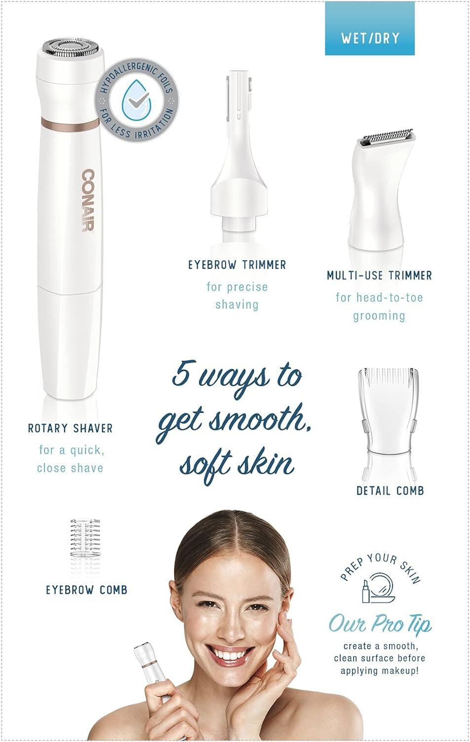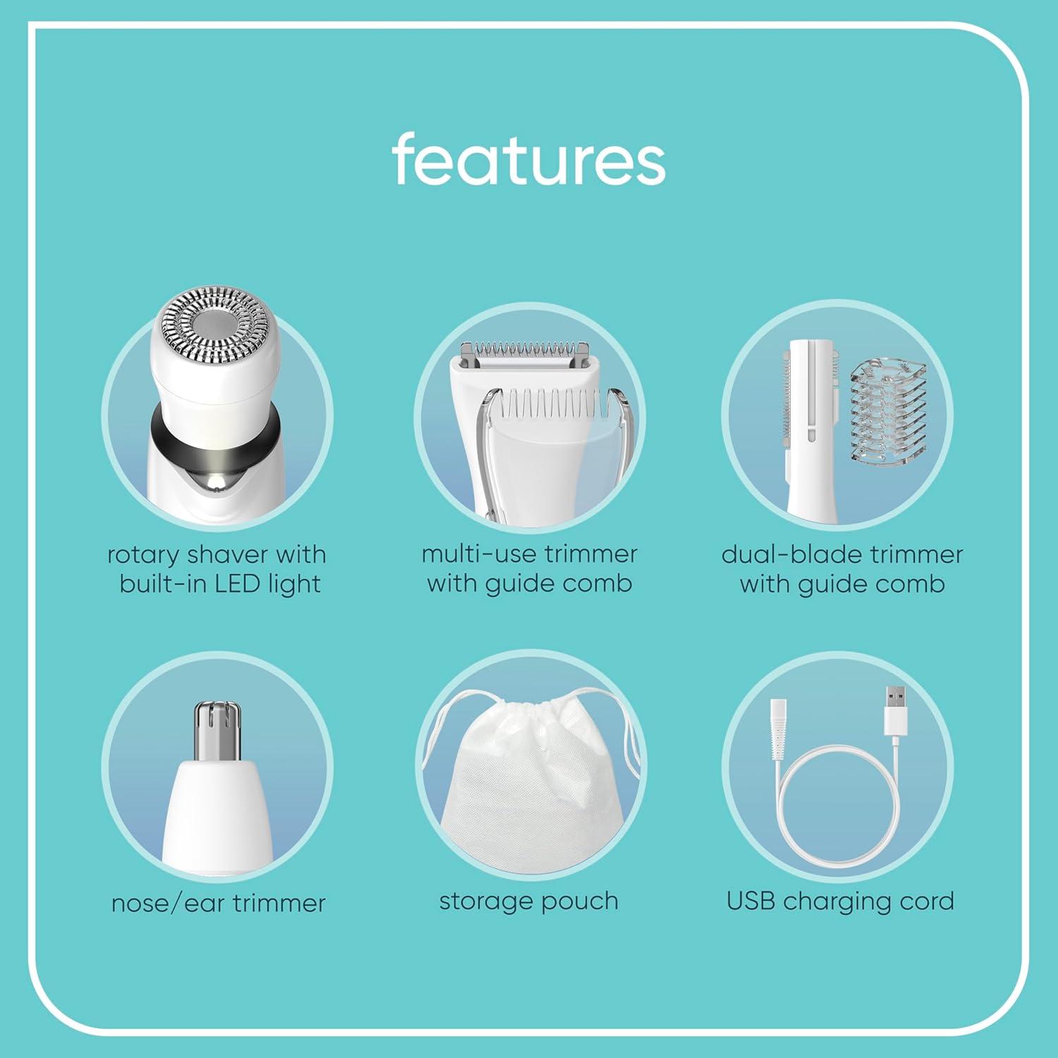 Look your very best from head to toe with the Conair® Girlbomb® grooming tool with interchangeable attachments. The All-in-One Face & Body Trimmer provides painless hair removal with smooth results. The compact, cordless tool can be used wet or dry and is perfect for home use or on-the-go touch-ups. Convenient storage pouch included. The comfortable handle charges with a USB cable for long-lasting use and has a simple on/off switch that activates the 4 attachments: a hypoallergenic rotary shaver for removing fine hair from upper lip, chin, cheeks, and jawline, nose and ear trimmer for gently removing unwanted hair, eyebrow trimmer with guide comb to define and shape brows, and multi-use trimmer with guide comb for safely trimming body hair on sensitive areas. Tidy up eyebrows, remove fine nose, ear, and facial hair, and trim sensitive areas with safe, nick-free blades. The built-in LED light guides every move you make for flawlessly groomed skin. Switch attachments with a gentle twist and enjoy smooth skin with an effortless and completely cordless grooming experience.
