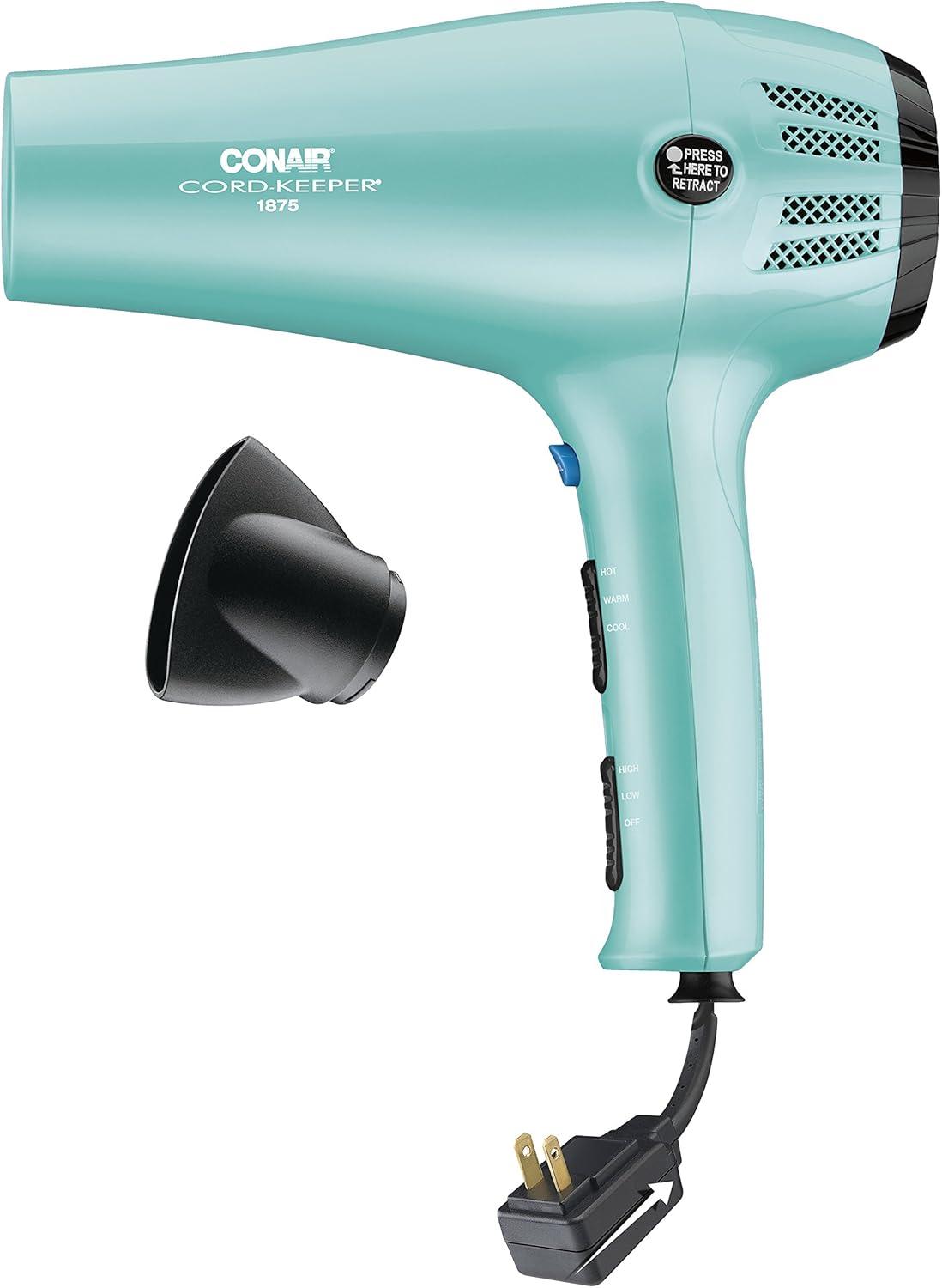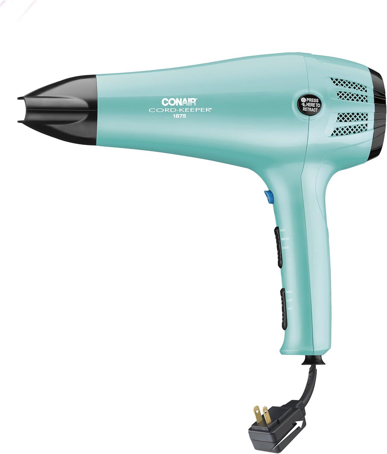 Conair Hair Dryer with Retractable Cord, 1875W Blow Dryer, 3 Heat Settings, 2 Speeds, Blow Dryer with Diffuser and Concentrator Attachments, Ionic + Tourmaline Technology, Pink(Aqua)