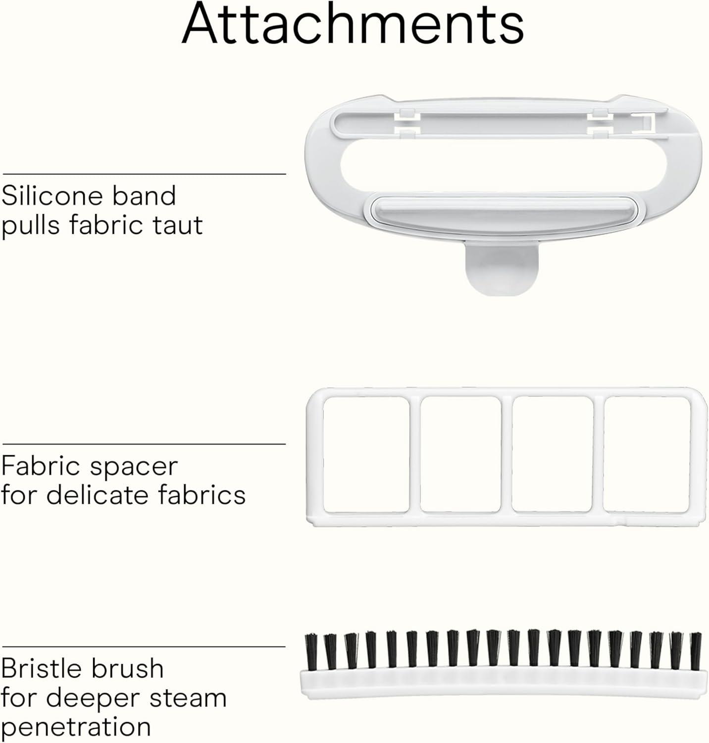 3-IN-1 ATTACHMENT: This portable steamer for clothes includes a silicone band to pull fabric taut, a delicate fabric spacer to protect trims and fine fabrics, and a bristle brush to ensure steam penetrates fibers for a perfect press, even on heavy fabrics.
