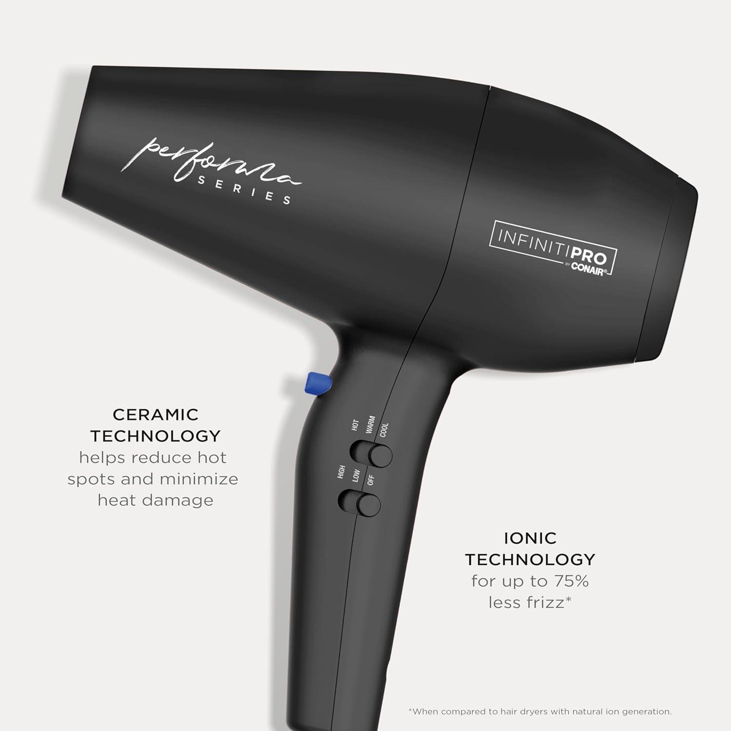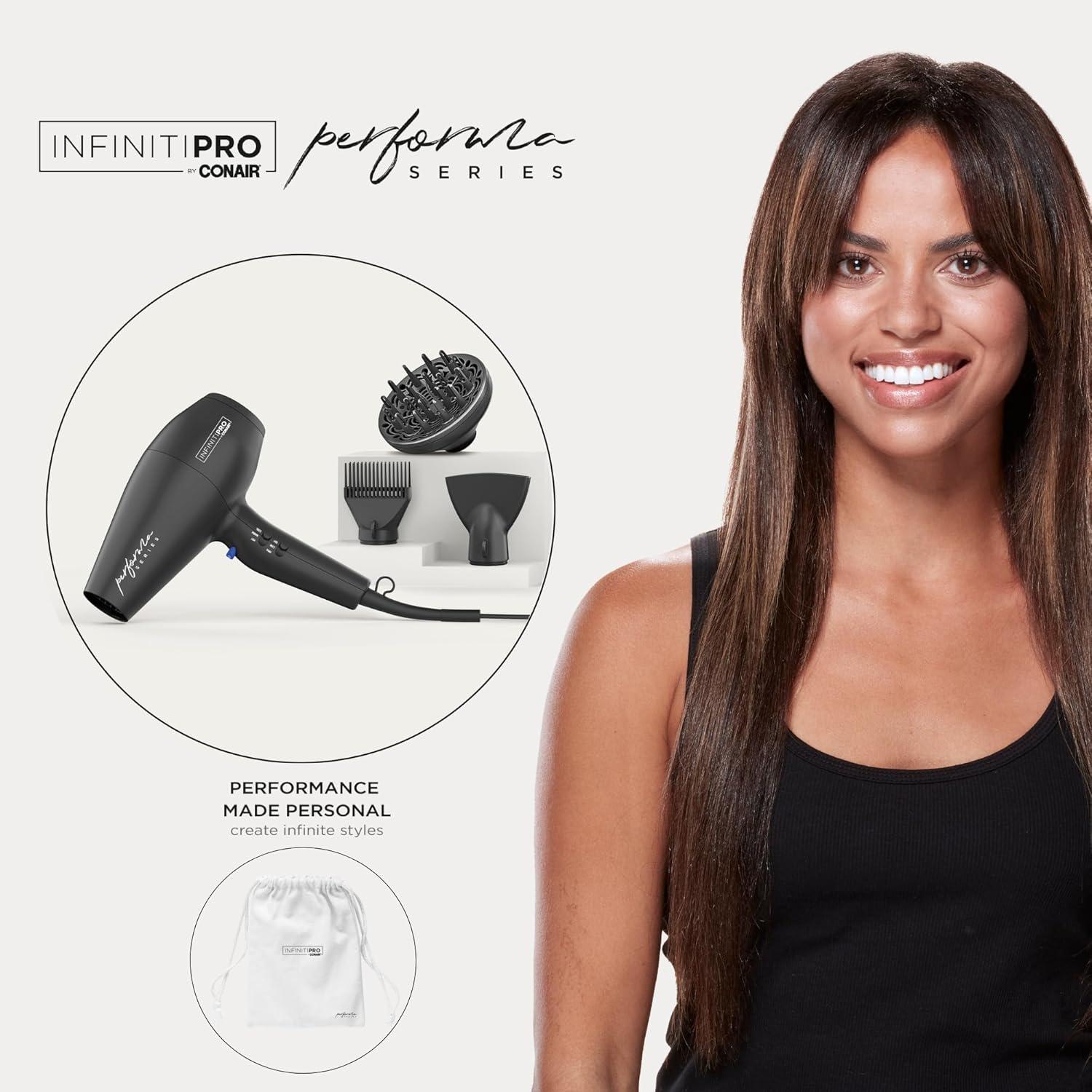Enhance your styling experience with true professional performance and explore limitless looks with the InfinitiPRO by Conair® Performa Series Dryer. Designed for all hair types and moments, this ultra-versatile dryer makes performance personal with 4 attachments and 7 total heat and speed settings that let you customize and change up your look — from classic curls to bombshell waves to straight, sleek styles. Powered by a professional AC motor that lasts up to 3x longer and dries up to 50% faster than our other DC motor hair dryers and stylers, the Performa Series Dryer helps reduce hotspots and minimize heat damage with ceramic technology. Fed up with frizz? Ionic technology tames the beast with 75% less frizz than hair dryers with natural ion generation. Swap out attachments depending on the look you want. Use the thermal concentrator for sleek, shiny styles or the thermal pik to detangle and add lift. Crave frizz-free curls and waves? The diffuser delivers the gentle airflow you need. How about precision styling? The concentrator focuses airflow to smooth and straighten. When you achieve a look you love, lock it in with the cold shot. A removable filter makes this dryer easy to clean and maintain for optimal performance and years of salon-caliber styling.