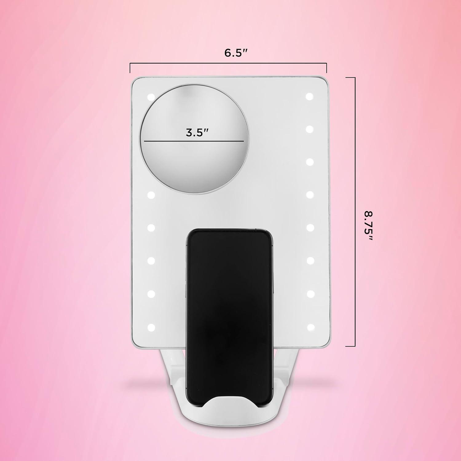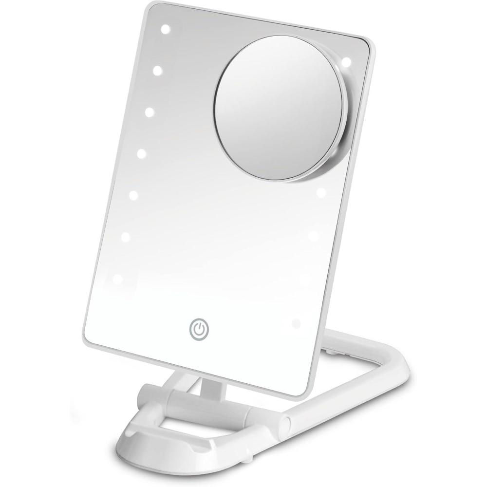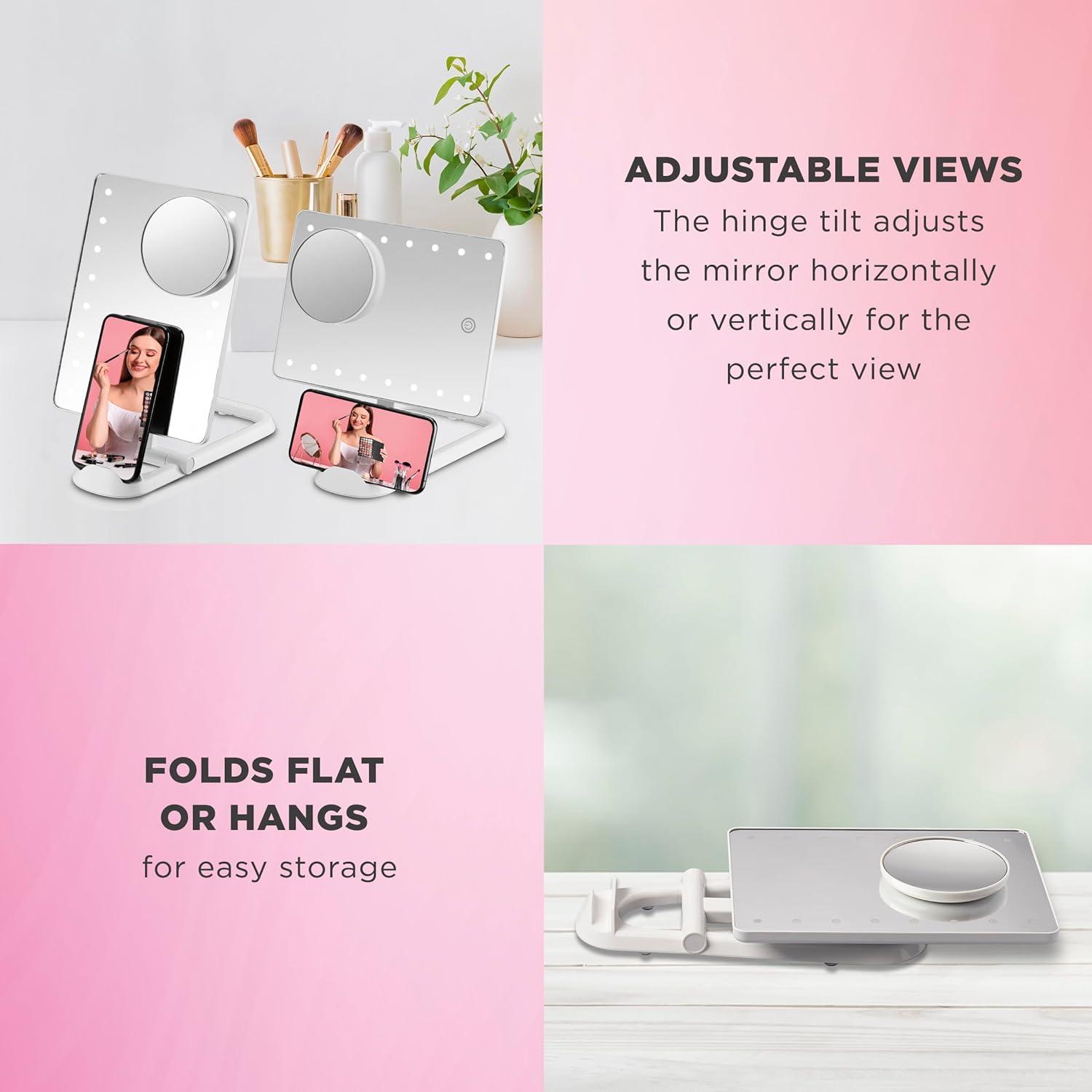 Perfect for quick-and-easy social media posting, the LED Hollywood Lighted Social Media Mirror from the Conair Reflections Unfiltered Vibes collection is the multipurpose must-have that helps you look like a star in every snap. Specially designed with a phone holder built into the base, it's the perfect tool for following beauty tutorials and creating content without moving from the mirror. Your phone stays right at your fingertips while you perfect for your hair and makeup. The LED lighting lasts a lifetime, so our bulbs won't burn out or diminish. There's no need for replacement bulbs–ever. Energy-efficient, ambient light ensures precise makeup application and grooming. Touchscreen controls make it easy to choose from 3 light settings–low, medium, and high. 1x magnification gives you a full view of your face while doing your hair or taking a selfie. Use the smaller, magnetic mirror for 10x spot magnification and up-close tweezing or applying eyeliner. The adjustable stand tilts the mirror horizontally or vertically, so you always see yourself from the perfect angle–no more twisting your neck to get the right view. Just prep and post–it's simple and seamless with this innovative mirror made for your busy social media profile. The slim profile makes this battery-operated beauty essential easy to fold, hang, or lie flat for convenient storage at home or on the go.