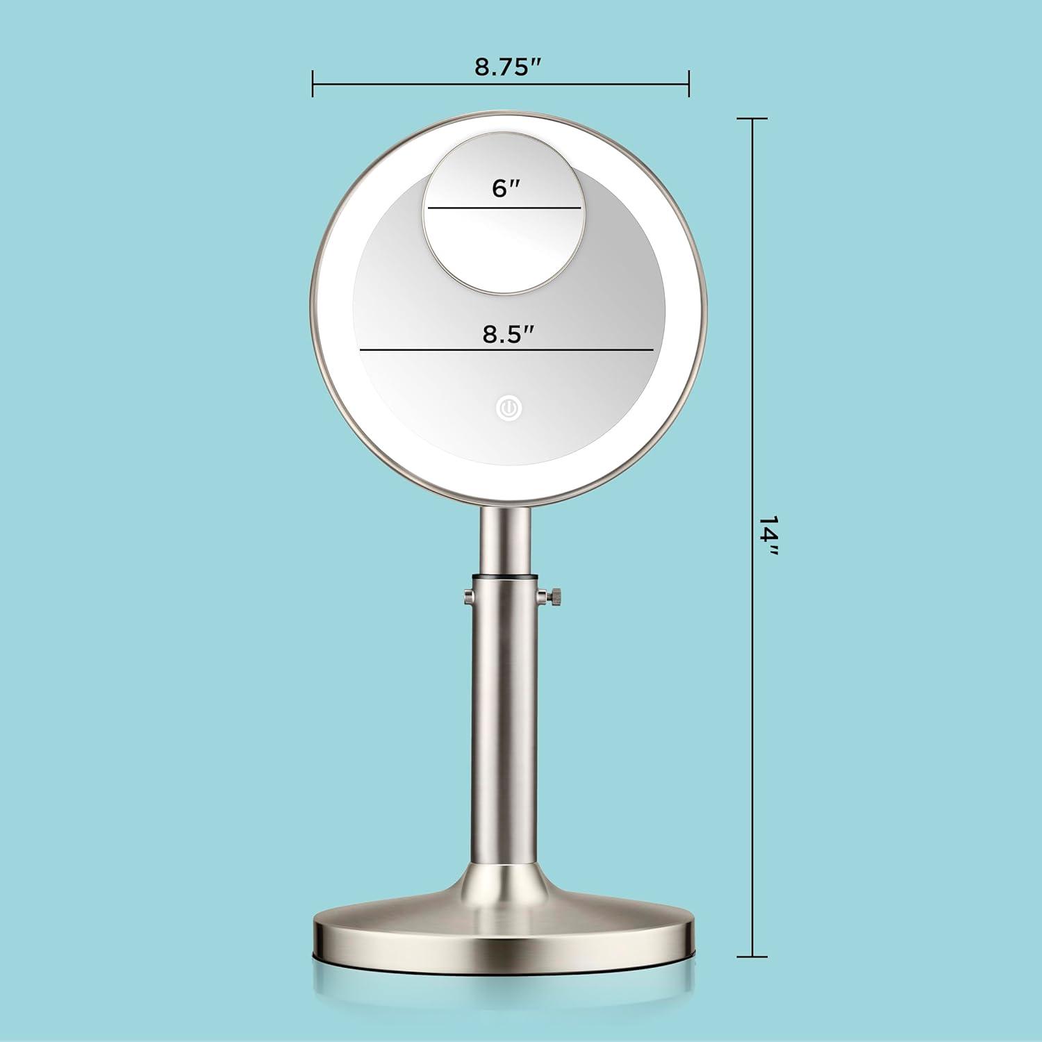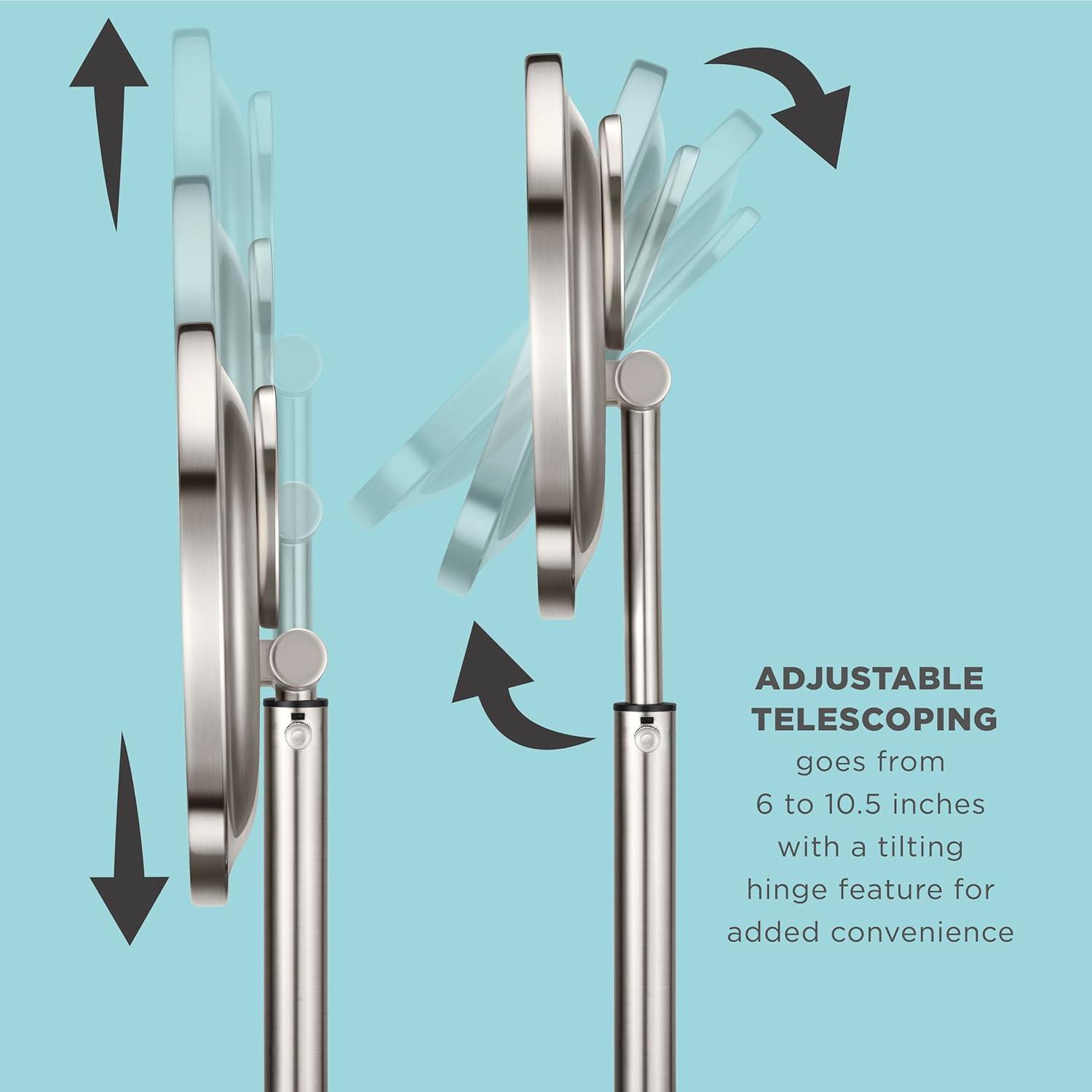 Stylish Surroundings: This 8.5″ diameter round mirror features a stylish satin nickel finish that compliments any decor. Tilt to any angle to perfect your look. Choose from 3 light settings. Reflection will be distorted if not within 6″ of mirror.