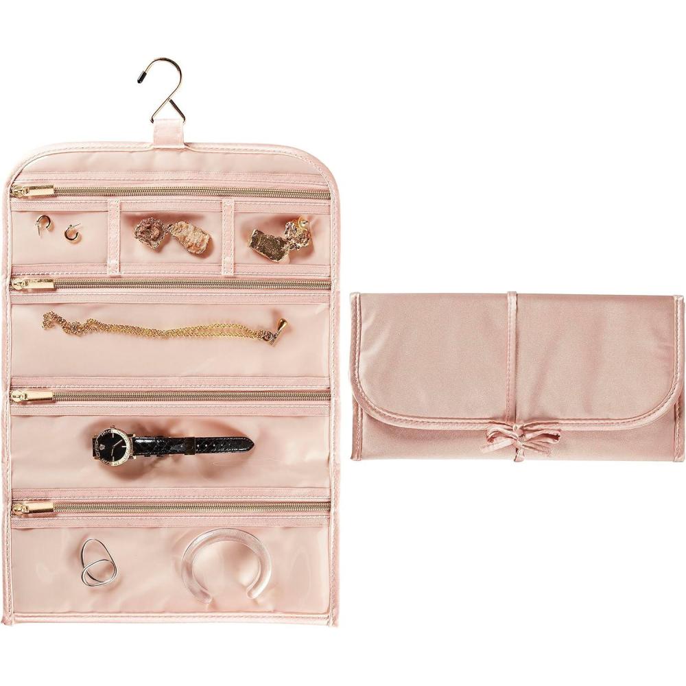 Jewelry Bag: Made of vinyl and fabric, this blush pink Conair Travel Smart Jewelry Travel Bag is perfect for keeping jewelry organized when traveling, featuring a hanger hook that lets you suspend your collection from doors and mirrors for easy visibility and access