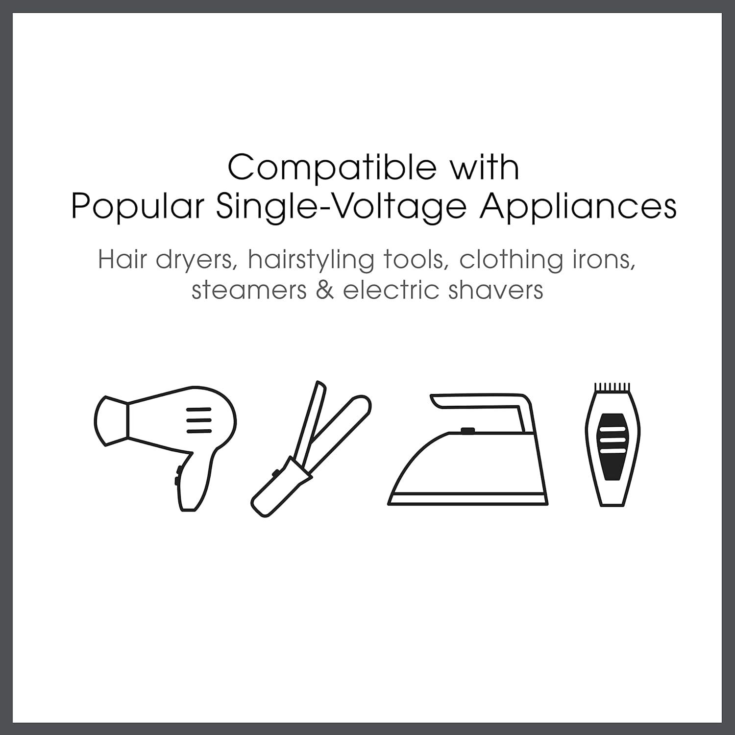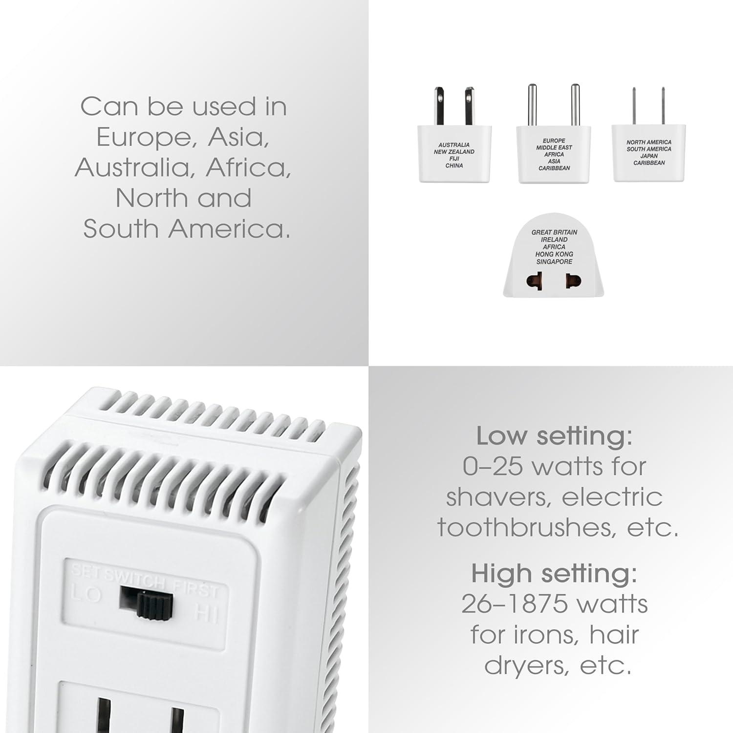 Power Converter with Surge Protection: Power adapter with built-in surge protection and an EMI/RFI power line filter that safeguards travel appliances from spikes in electricity; this wattage converter accepts grounded, non-grounded, polarized and non-polarized plugs from all over the world