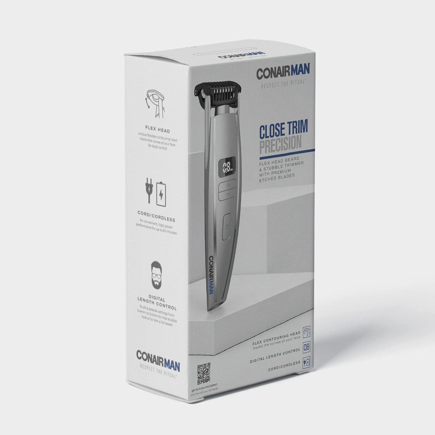 Take control of your grooming regimen with the customizable tool designed to follow the contours of your face for the perfect trim. Engineered for cord or cordless convenience and superior performance, the ConairMan® Close Trim Precision Flex Head Beard & Stubble Trimmer with Advanced Blade Technology features a unique contouring head that flexes to conform to your facial curves for a perfect trim. Premium Etched Blades combine extreme sharpness and durability with complete safety to provide an ultra-close trim with no nicks. The Digital Length Control makes it easy to adjust the length from a 0.4 mm shadow look to a 5.0 mm beard, so you get exactly the look you want. Customize your look with a total of 15 ultra-precise length settings, from stubble to full beard trimming. Flip back the guide comb and use the blade for detailing and edging. The LCD screen displays the length you select and charge time remaining—up to 60 minutes on a single charge. You can also use this versatile tool to trim your body hair for a perfectly groomed look. When you're done, use the travel lock to keep the trimmer off when on the go or stored away.