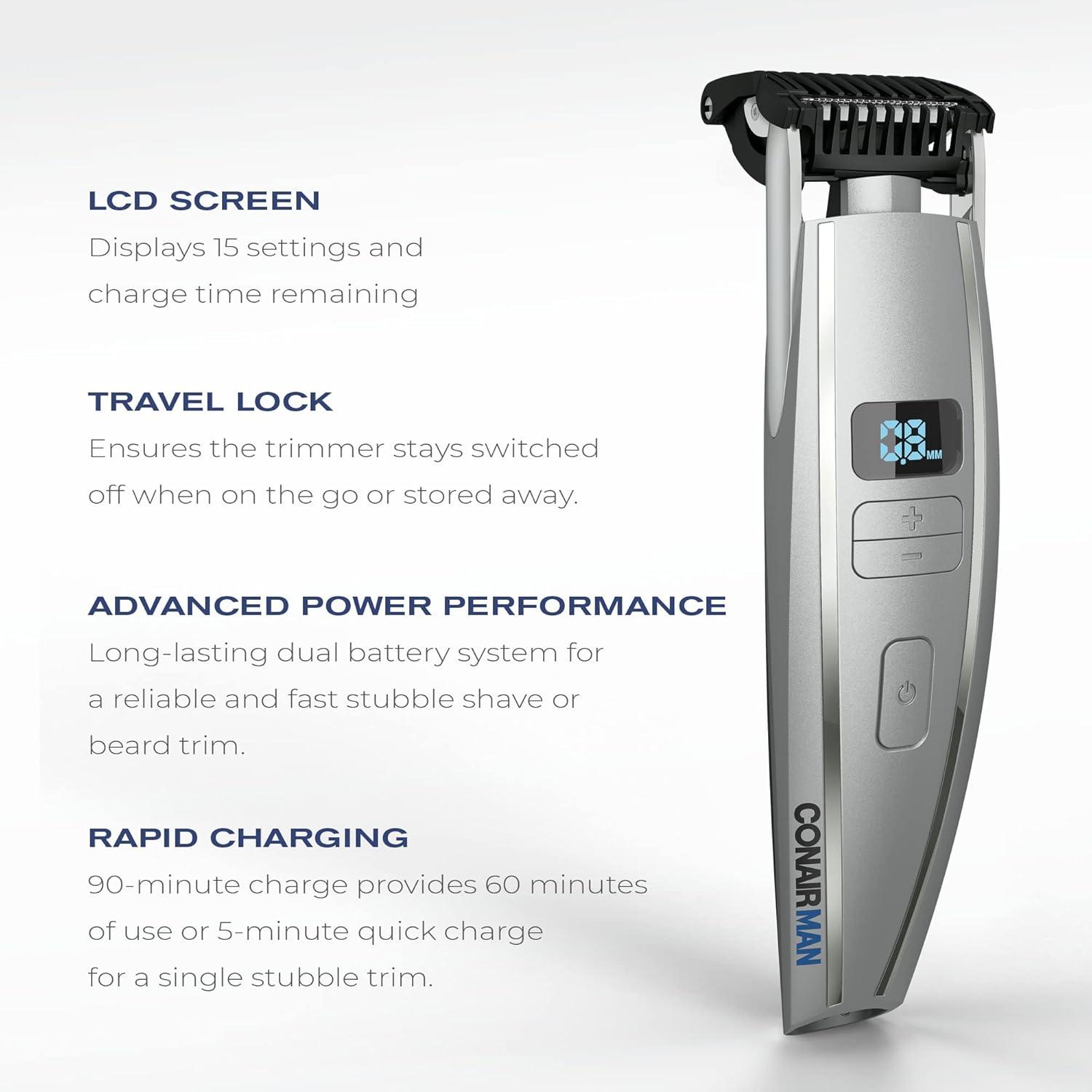 Beard Trimmer with Digital Length Control: the ConairMAN Beard and Stubble Trimmer offers 0.4 mm to 5.0 mm with precise automatic adjustments for ultimate length control. The LCD Screen displays selected length and charge time remaining.