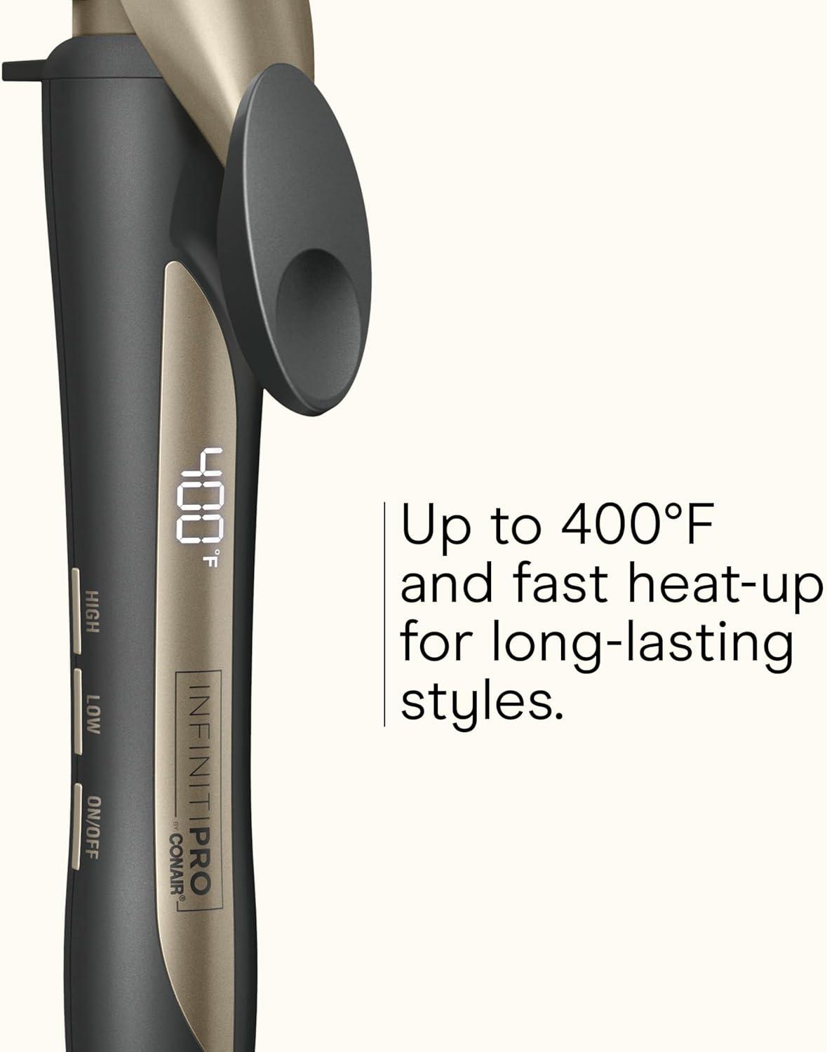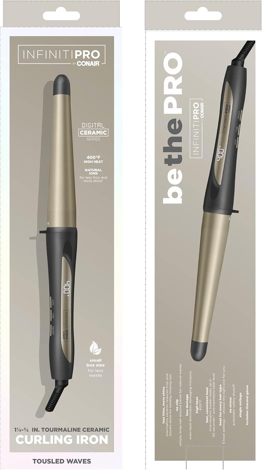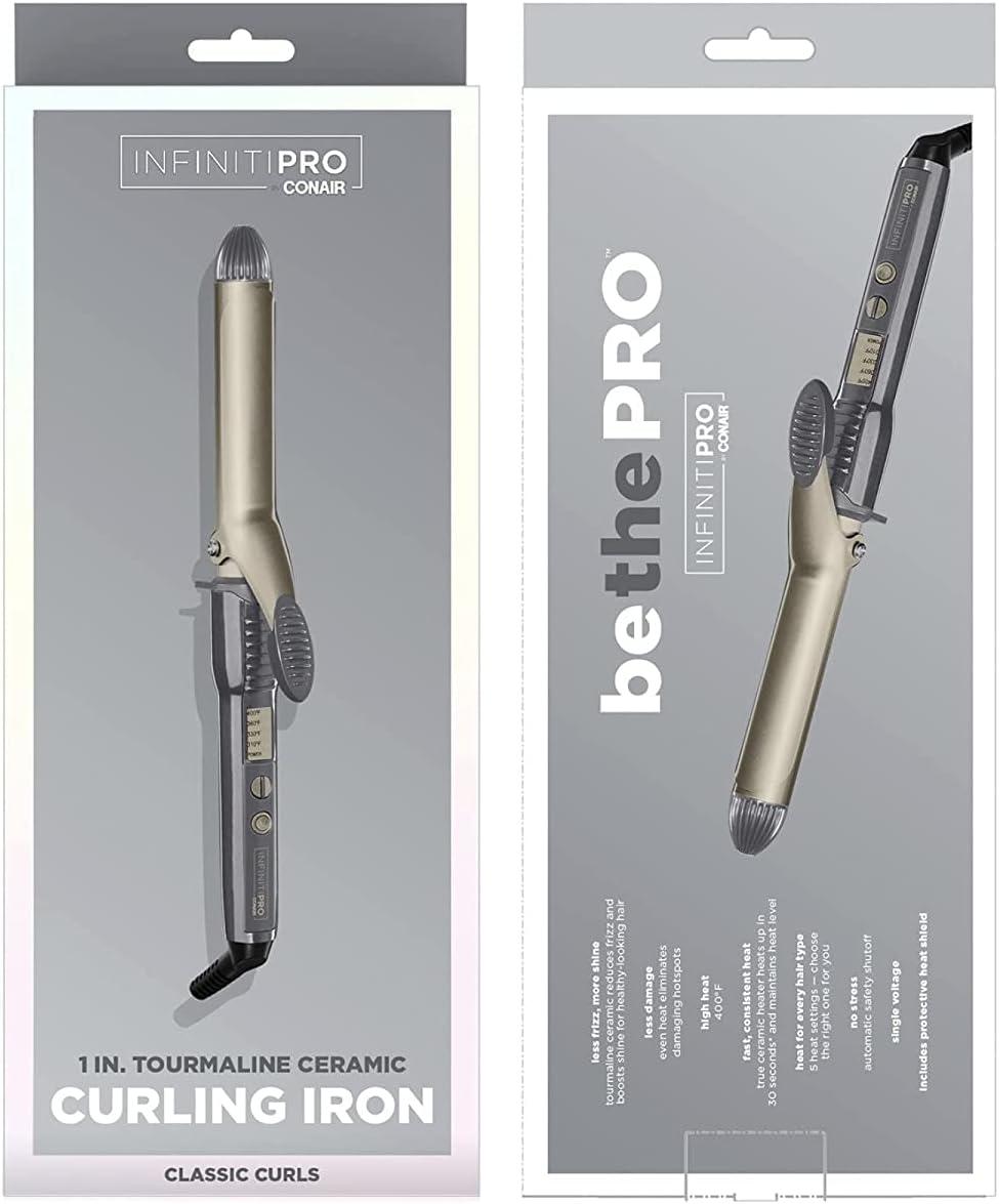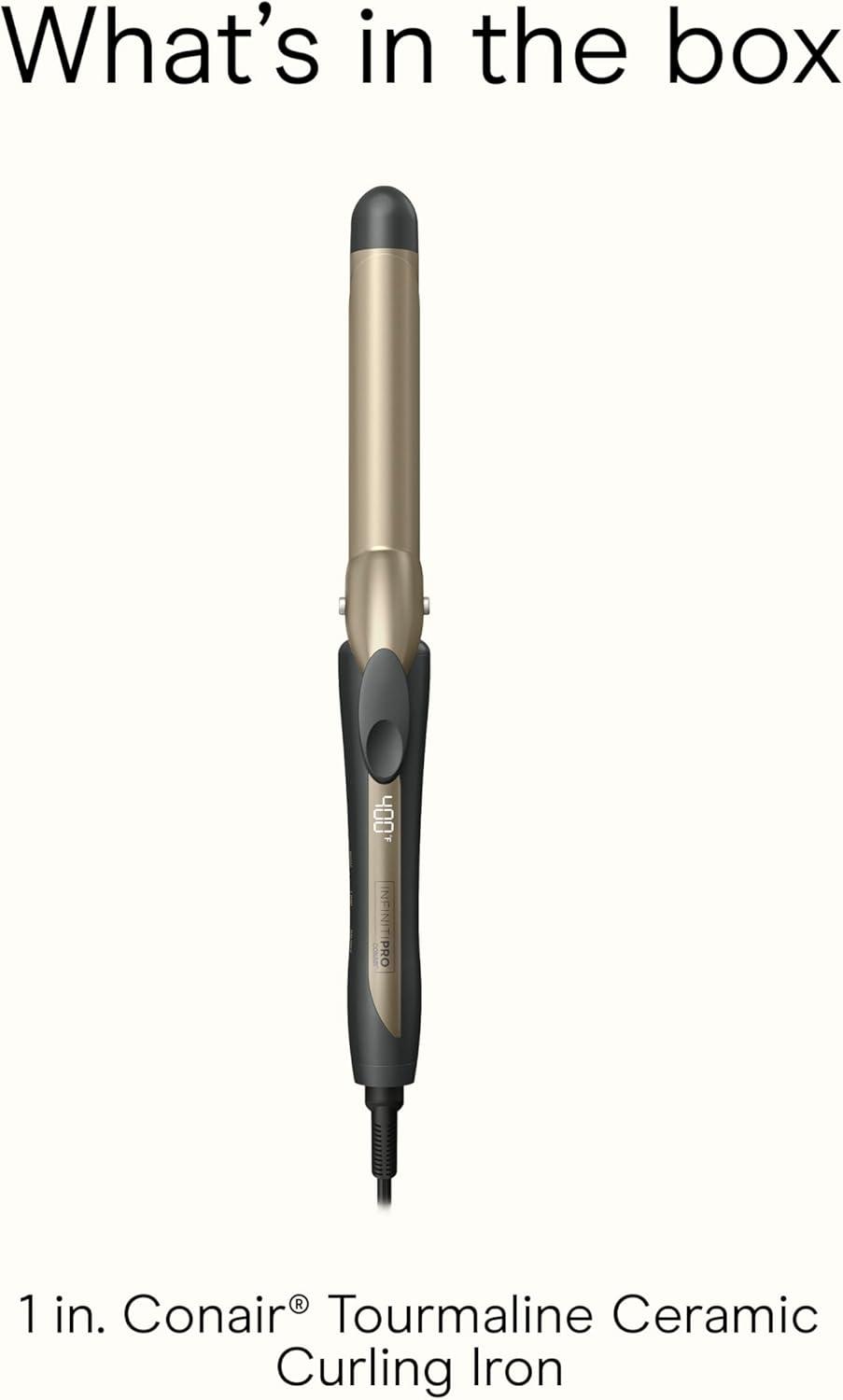 Shiny, frizz-free curls meant to impress! With frizz-fighting ions, customizable temperature settings, and even heat for less damage, the INFINITI PRO CONAIR Tourmaline Ceramic 1¼-Inch Curling Iron lets you create the luxurious loose curls you love. Designed to maximize curl definition and volume, this hair curler styling essential features a tourmaline ceramic-coated barrel to reduce frizz and give you smooth, shiny results. The true ceramic heater of this barrel curling iron heats up in 30 seconds and generates consistent heat as soon as it reaches a stabilized temperature for no damaging hot spots and a flawless finish The temperature select buttons and digital LED display make it easy to customize heat for your hair type. Choose from 5 heat settings up to 400°F. With such a wide range of heat options, there's a setting on this INFINITI PRO CONAIR Curling Iron for every hair type and texture.