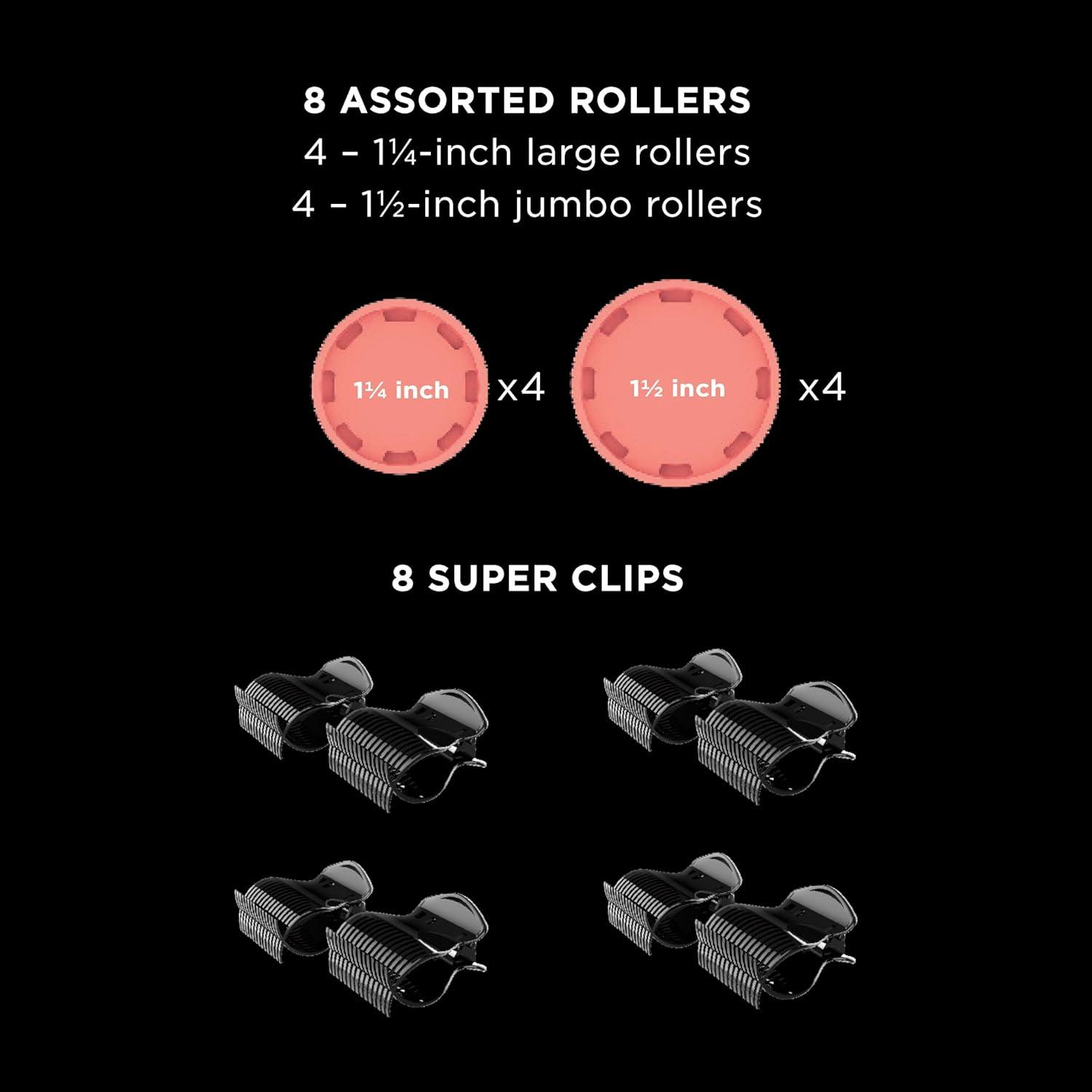 Full Set: Includes 8 plastic rollers of 2 sizes for custom curls and waves; four 1 1/2 inch jumbo rollers and four 1 1/4 inch extra large rollers include starter grip to prevent hair from sliding. Includes 20 super clips to keep the rollers in place.