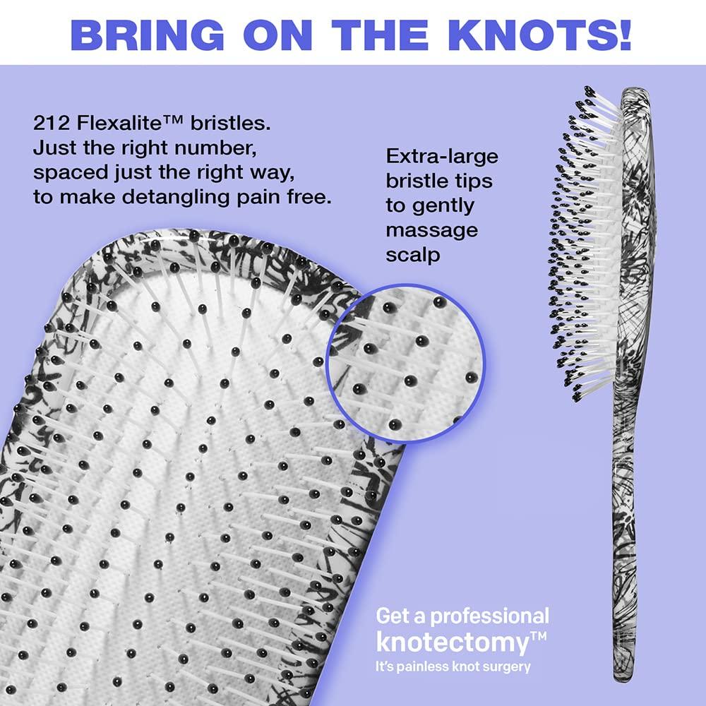 The Knot Dr. for Conair Pro Brite Detangler smoothly glides right through wet or dry hair, eliminating tangles without pulling or tugging. · Optimum Flexalite™ bristle count for painless detangling · Extra-large bristle tips gently massage scalp · Soft-touch finish for comfortable hold · Heat-resistant design – blow-dryer friendly